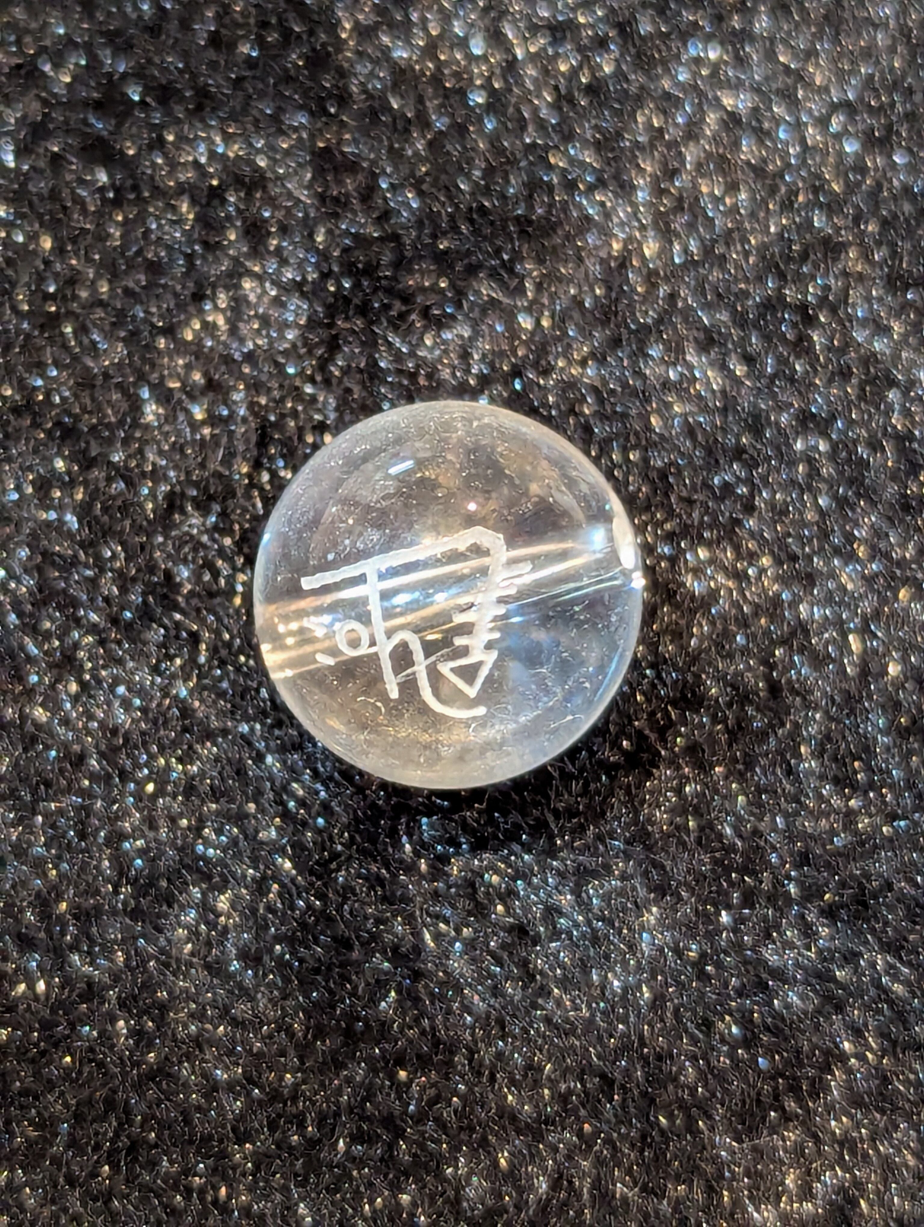 水晶の12ミリ玉ビーズに龍体文字を刻んだシリーズです。
