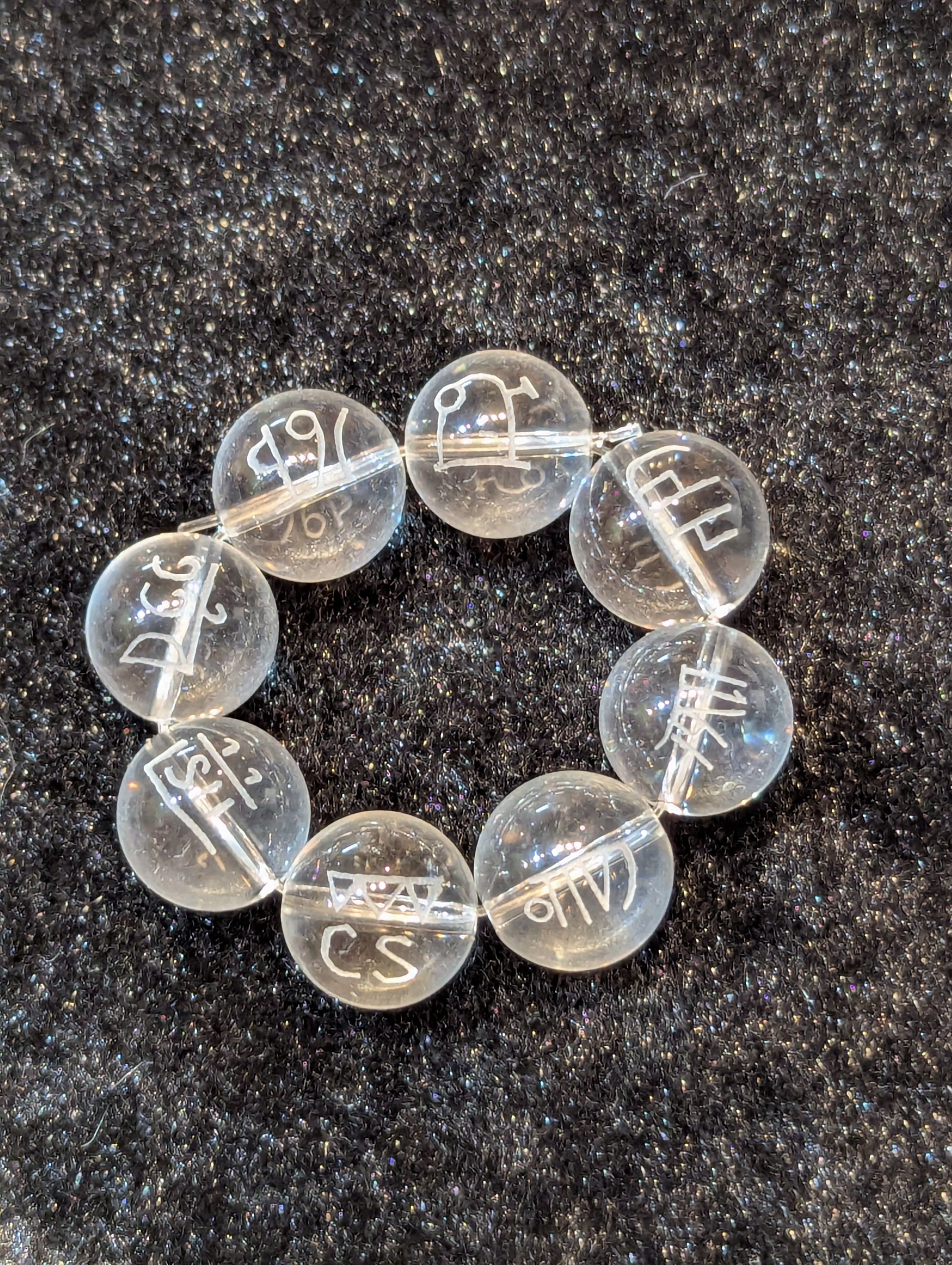 水晶の12ミリ玉ビーズに龍体文字を刻んだシリーズです。