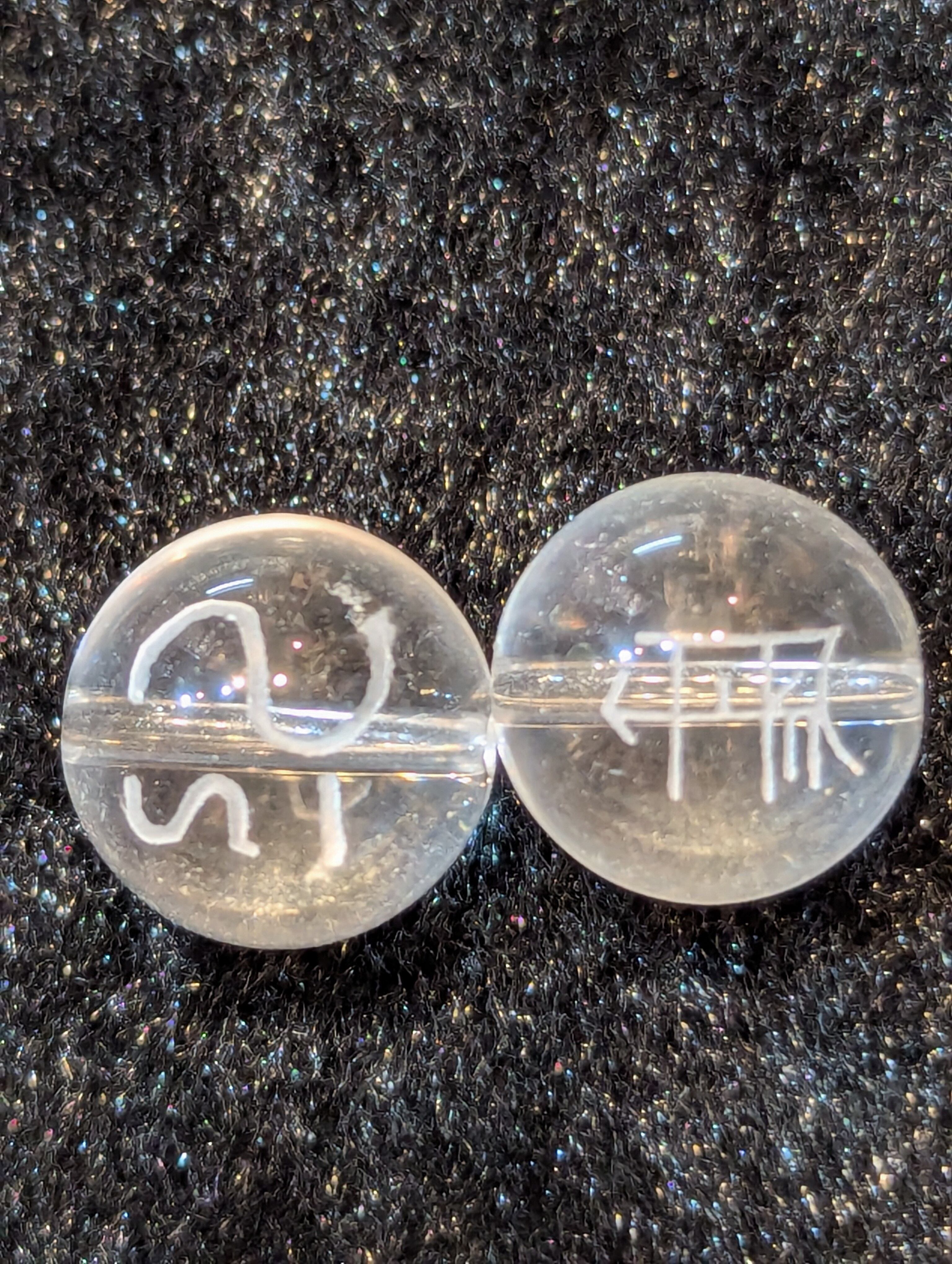 水晶の12ミリ玉ビーズに龍体文字を刻んだシリーズです。