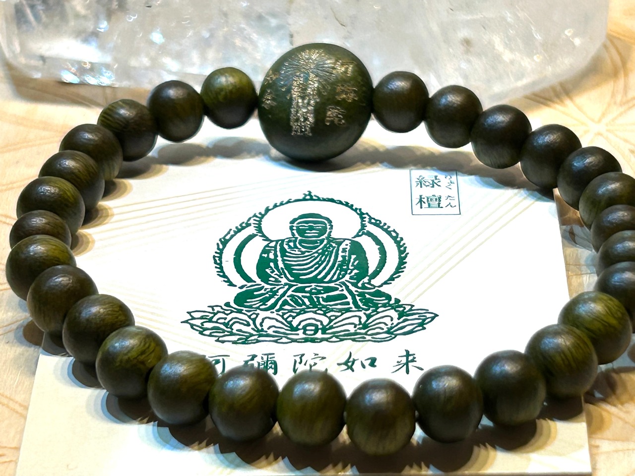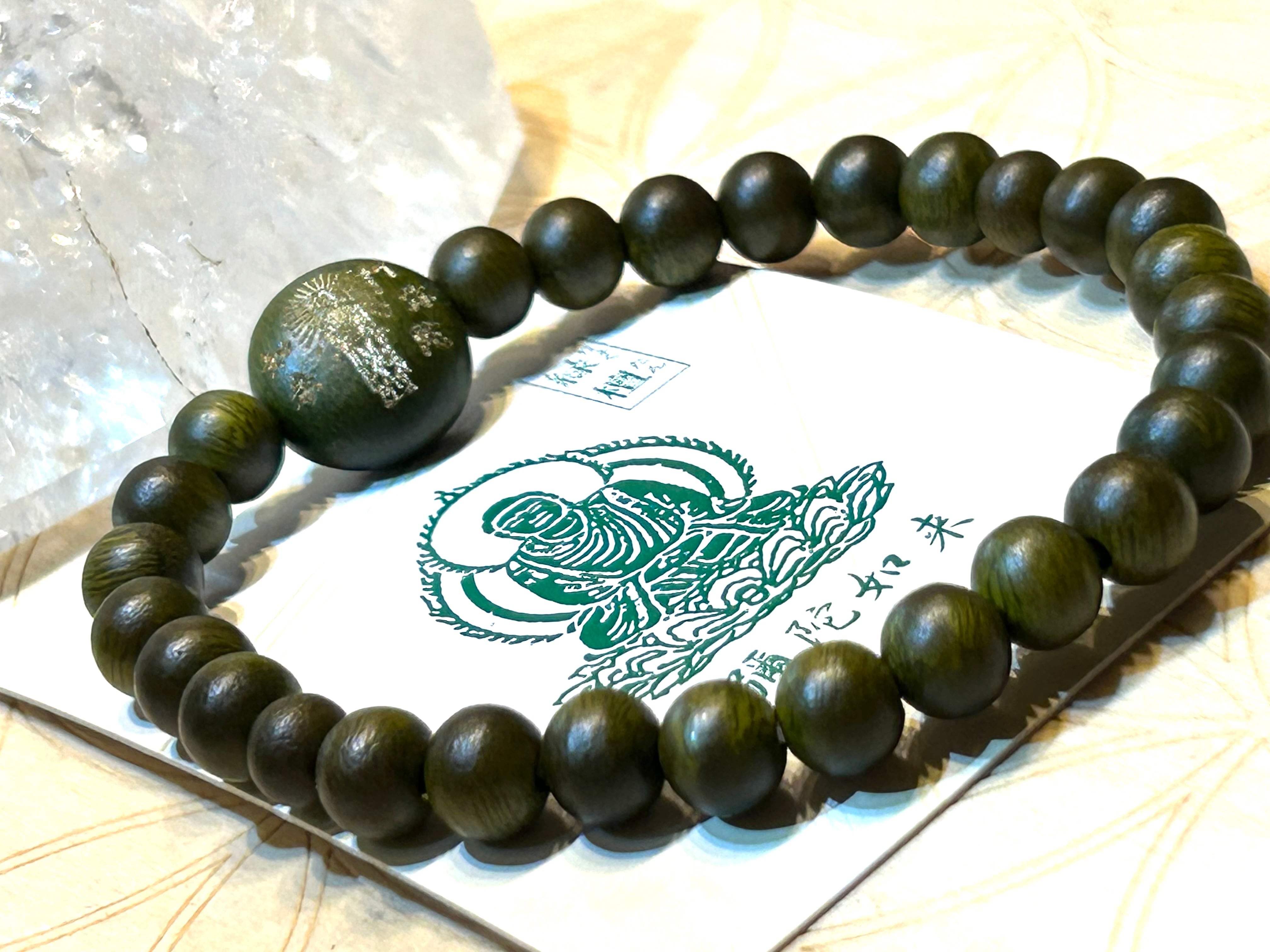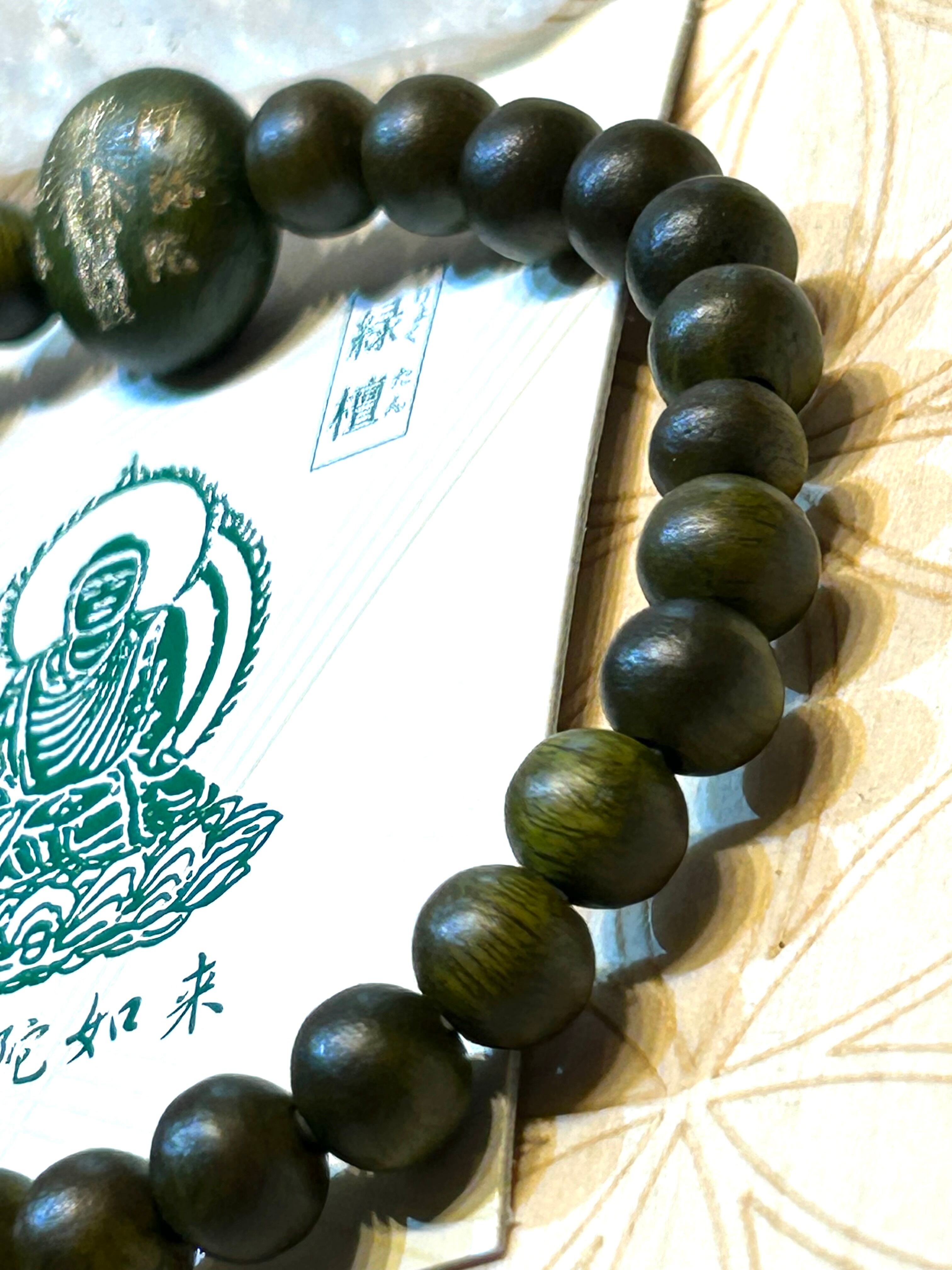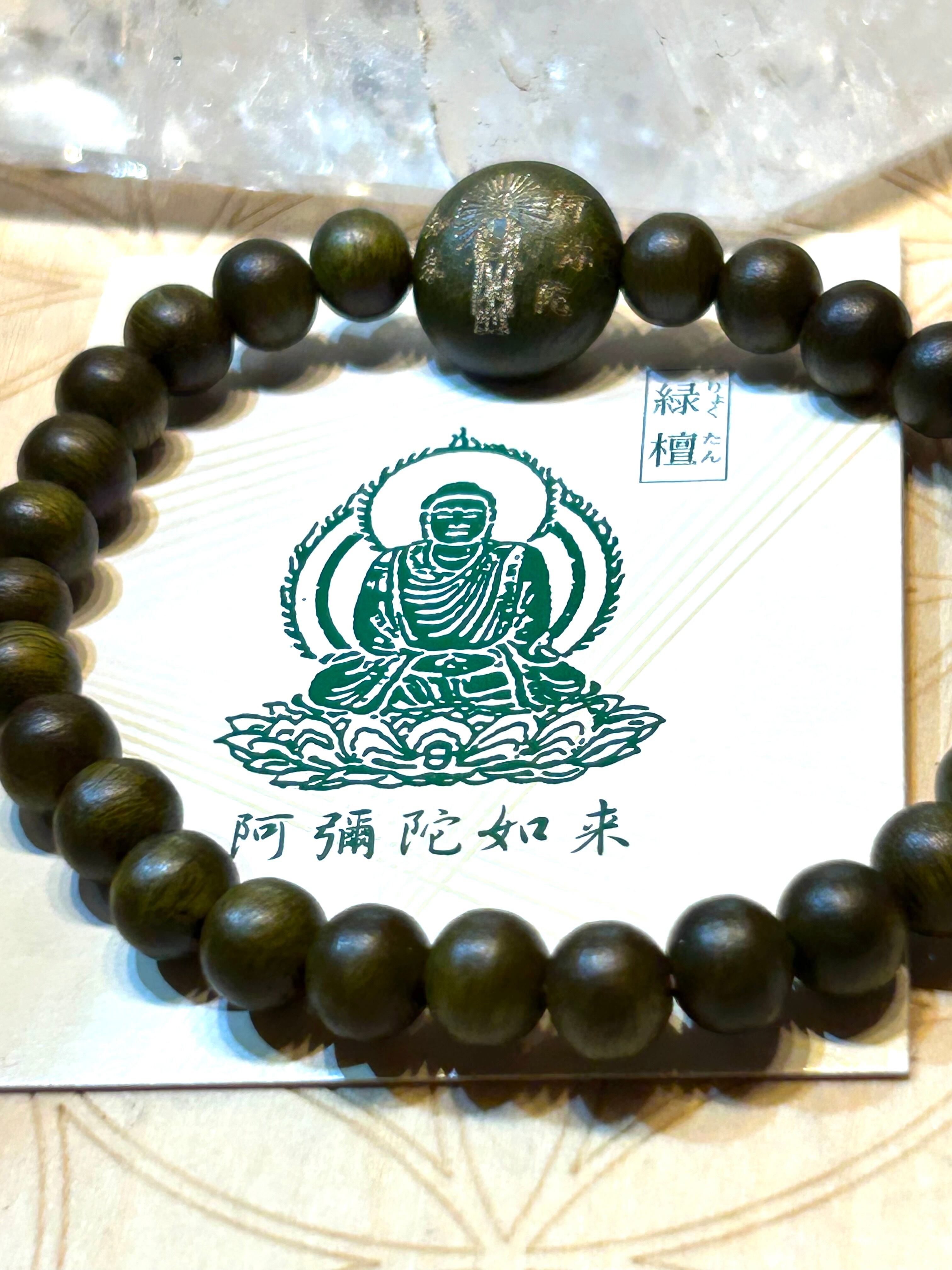美しい緑檀ビーズを使用したブレスレット。センターには阿弥陀如来が刻印されており、身に着けることで深い安らぎと守護の力を感じることができます。緑檀は、浄化やリラクゼーション、心の調和を促進する特性を持ち、持つ人に静けさをもたらすとされています。