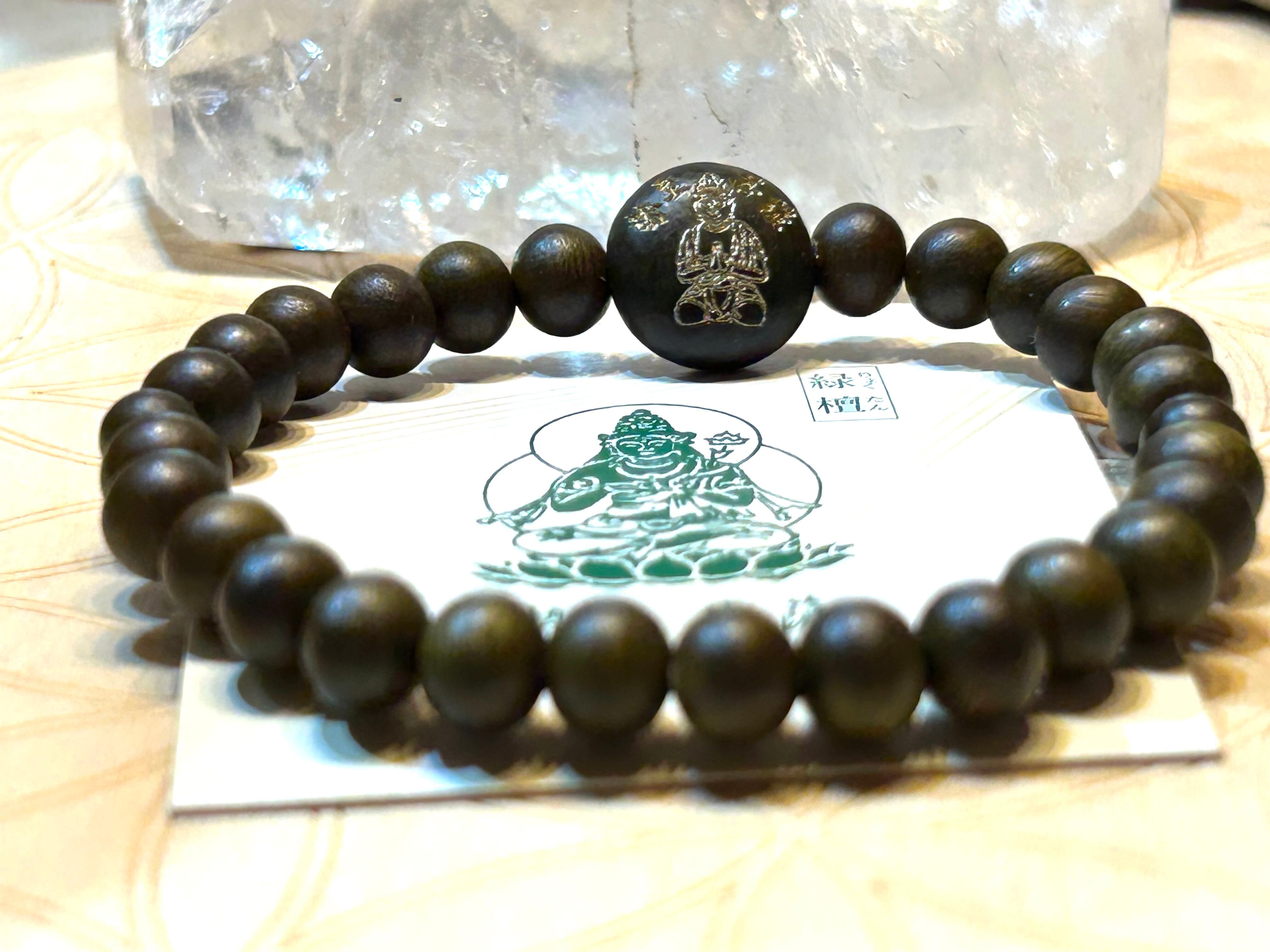 美しい緑檀ビーズを使用したブレスレット。センターには勢至菩薩の刻印が施されており、身に着けることで人々を導く力を感じることができます。緑檀は、心の浄化や深い安らぎを促進する特性を持ち、持つ人に穏やかな気持ちをもたらすとされています。