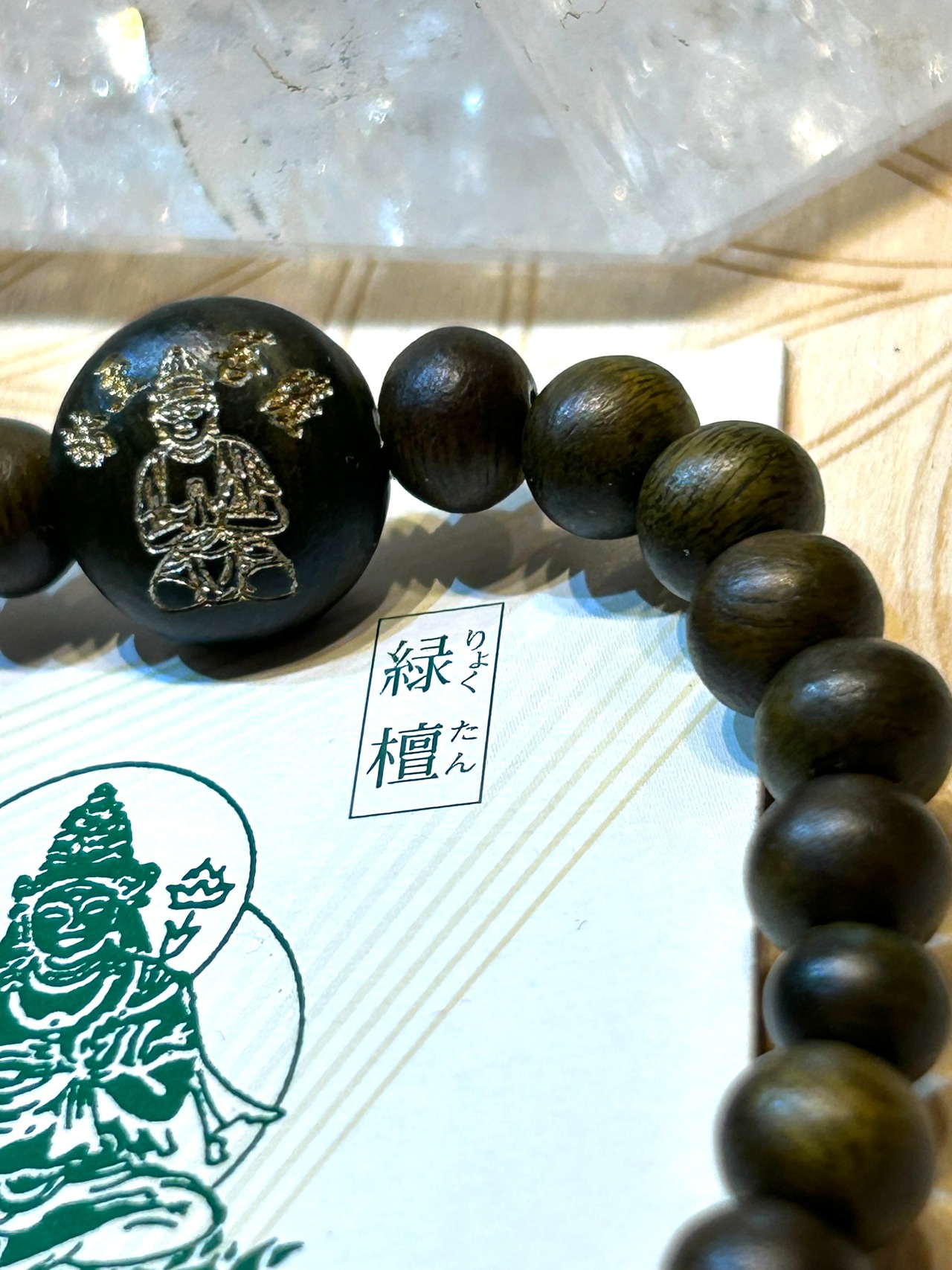 ビーズは約13ミリの勢至菩薩刻印ビーズを含む、緑檀ビーズ約6ミリ×28玉使用。内径約16センチで、日常使いにも適したサイズ感です。