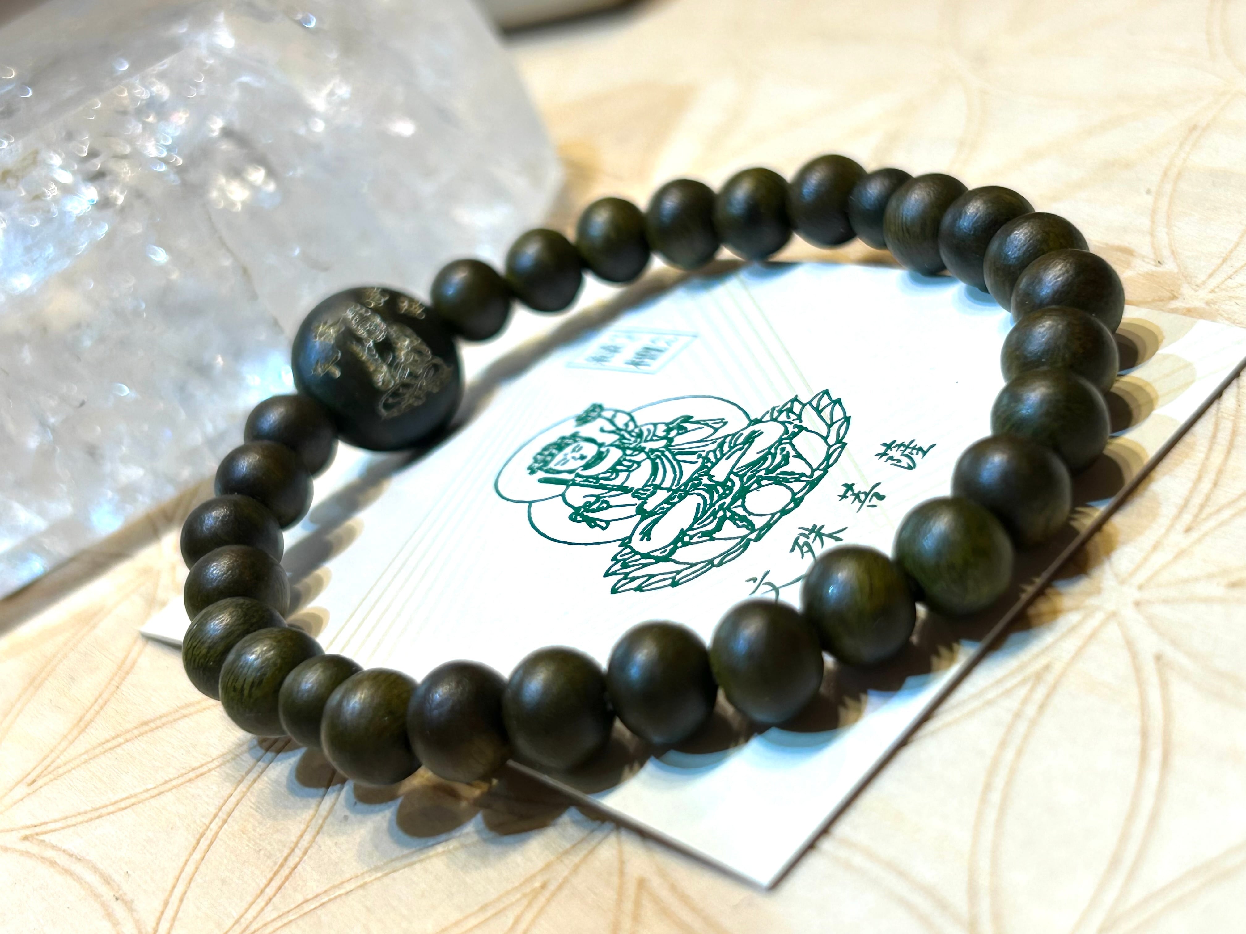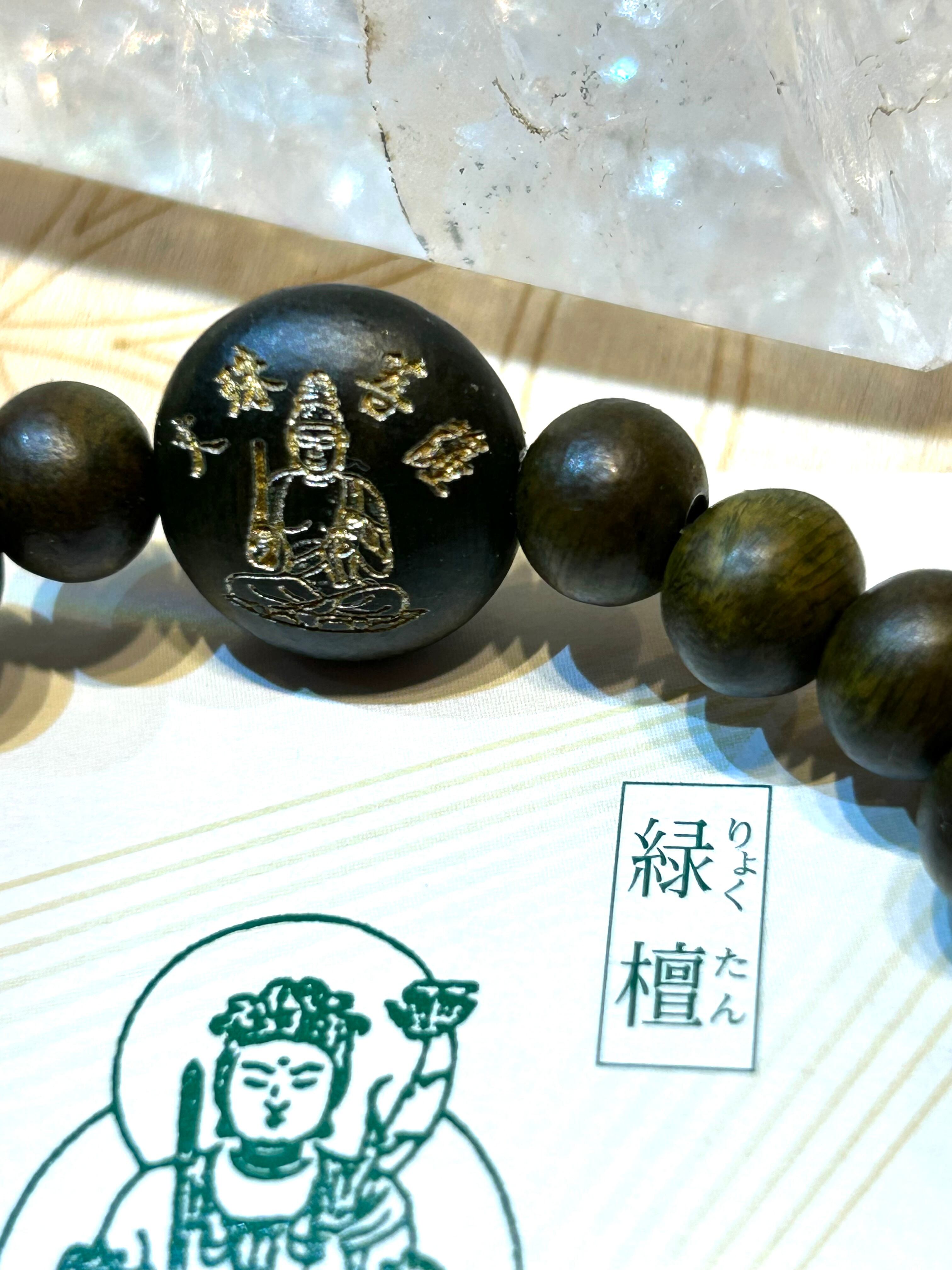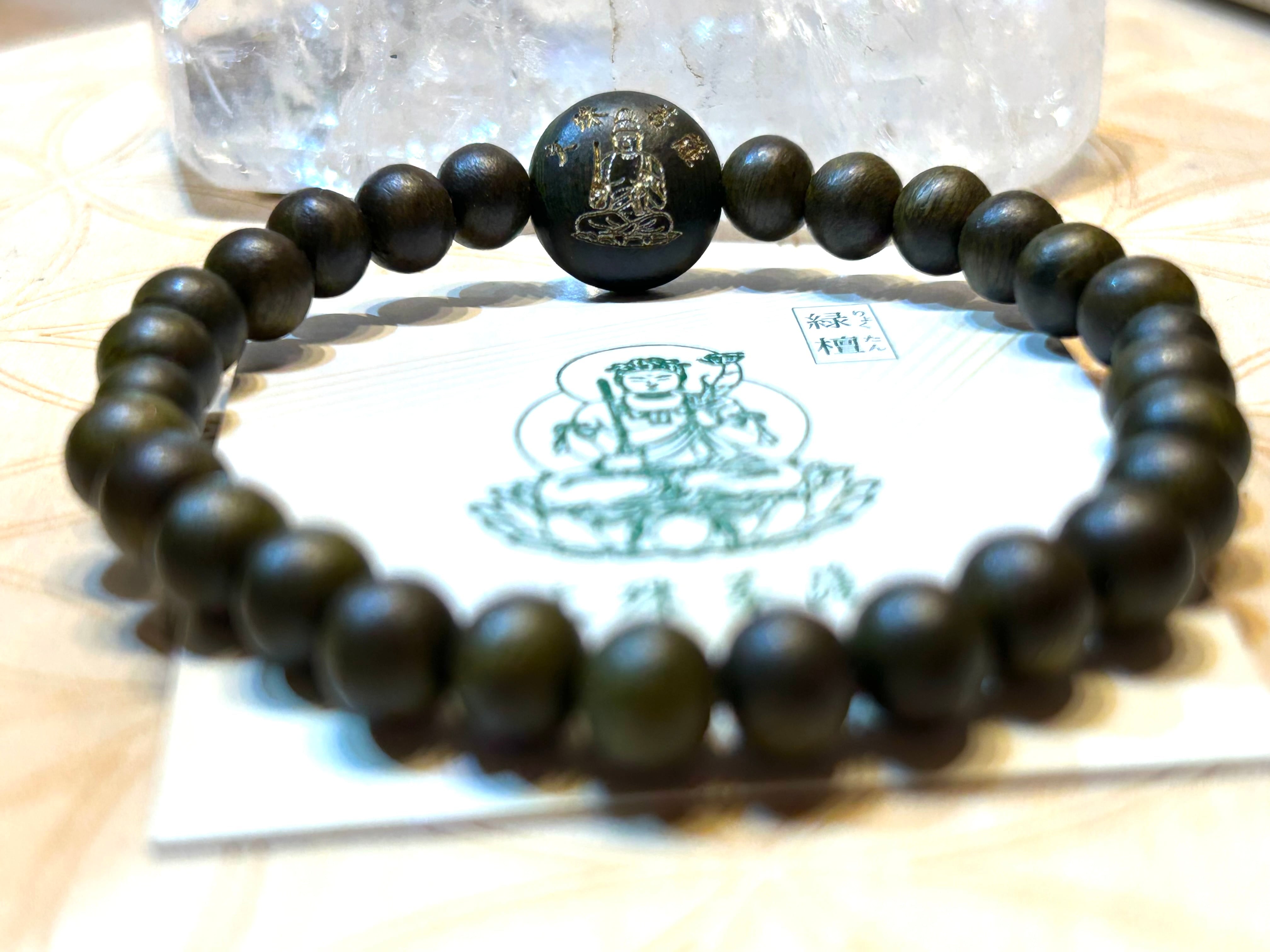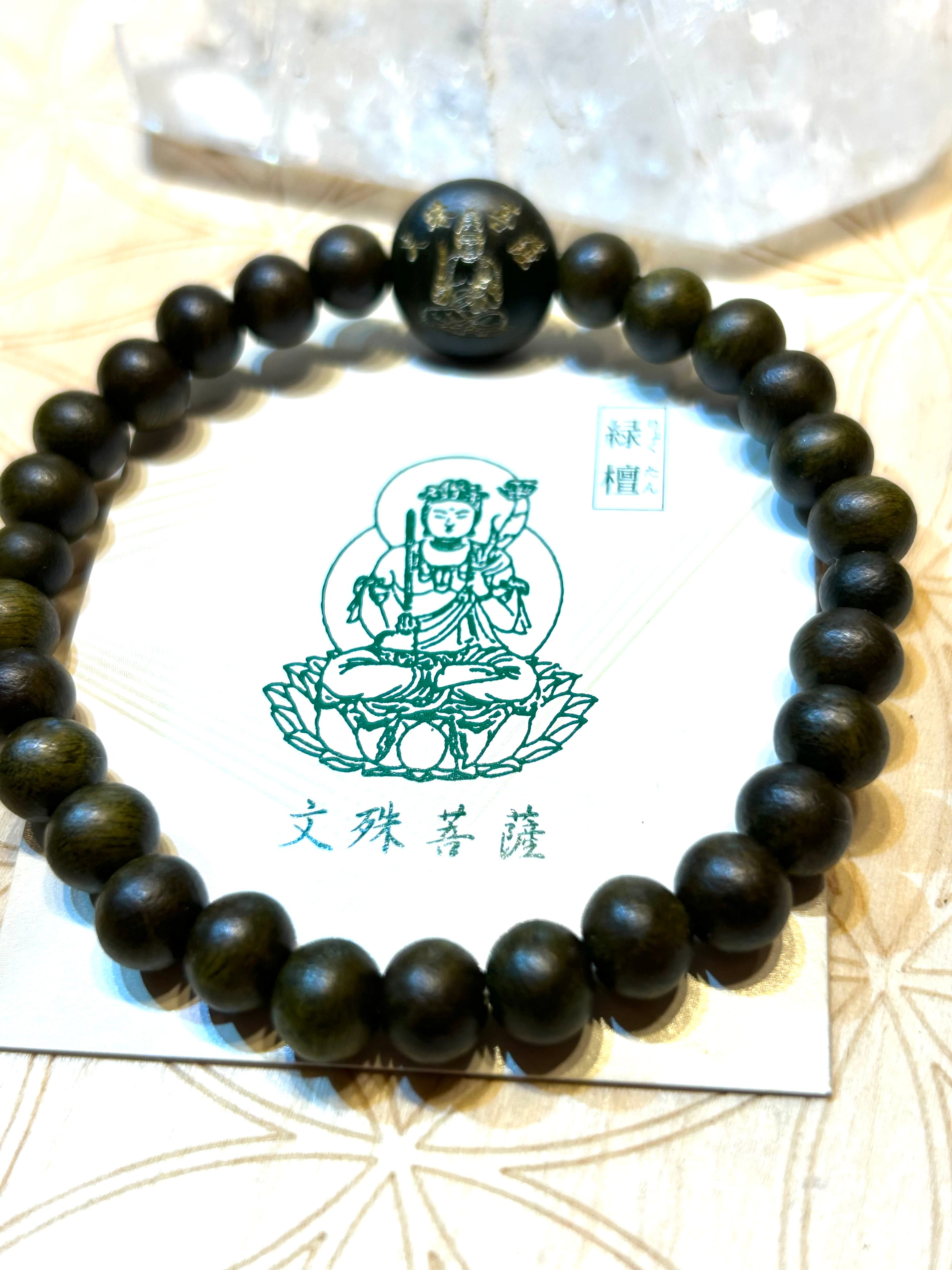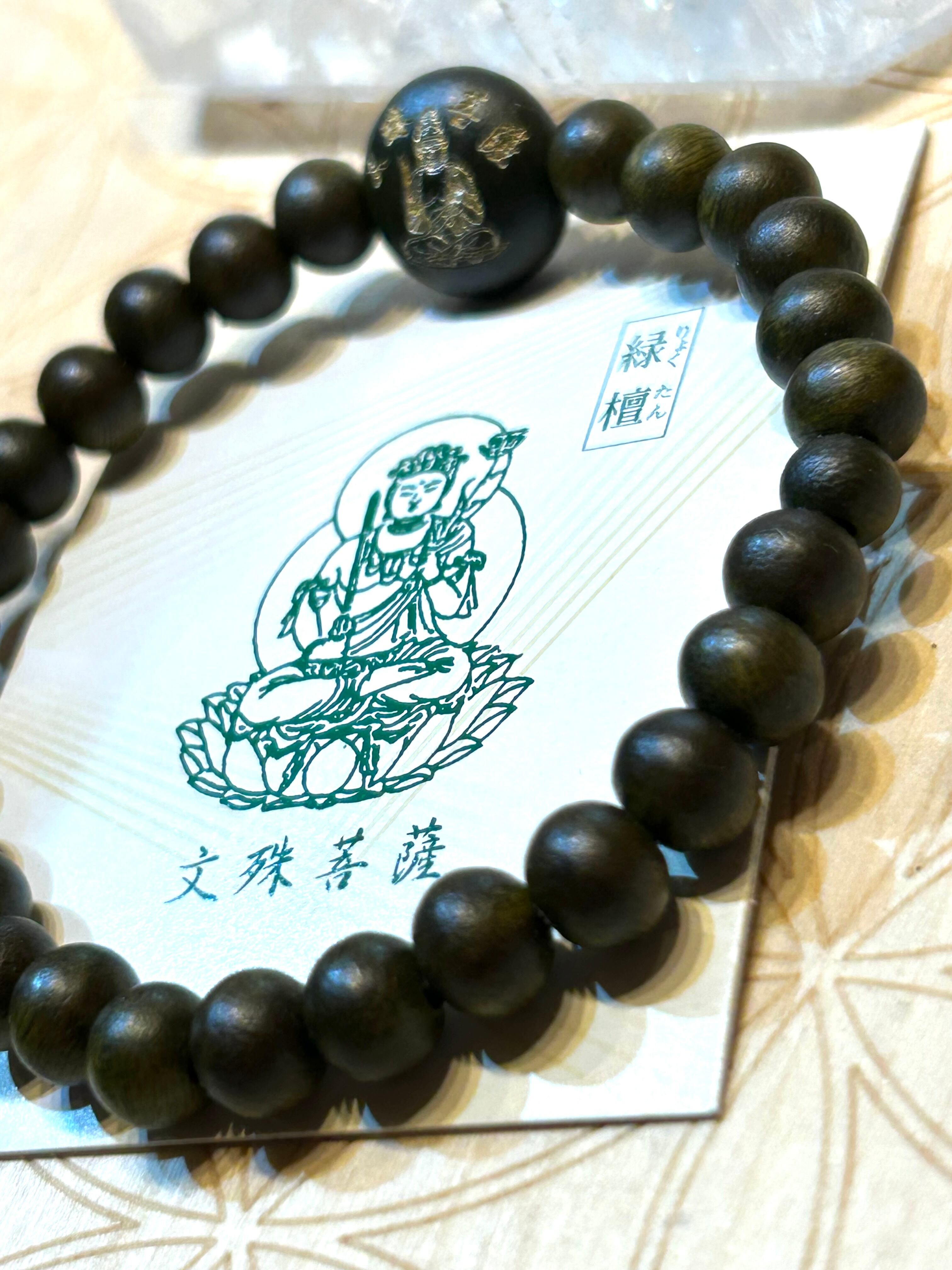 美しい緑檀ビーズを使用したブレスレット。センターには文殊菩薩の刻印が施されており、身に着けることで心に智慧をもたらす力を感じられます。緑檀は心の浄化や深い安らぎを促進する特性を持ち、持つ人に穏やかな気持ちを提供します。