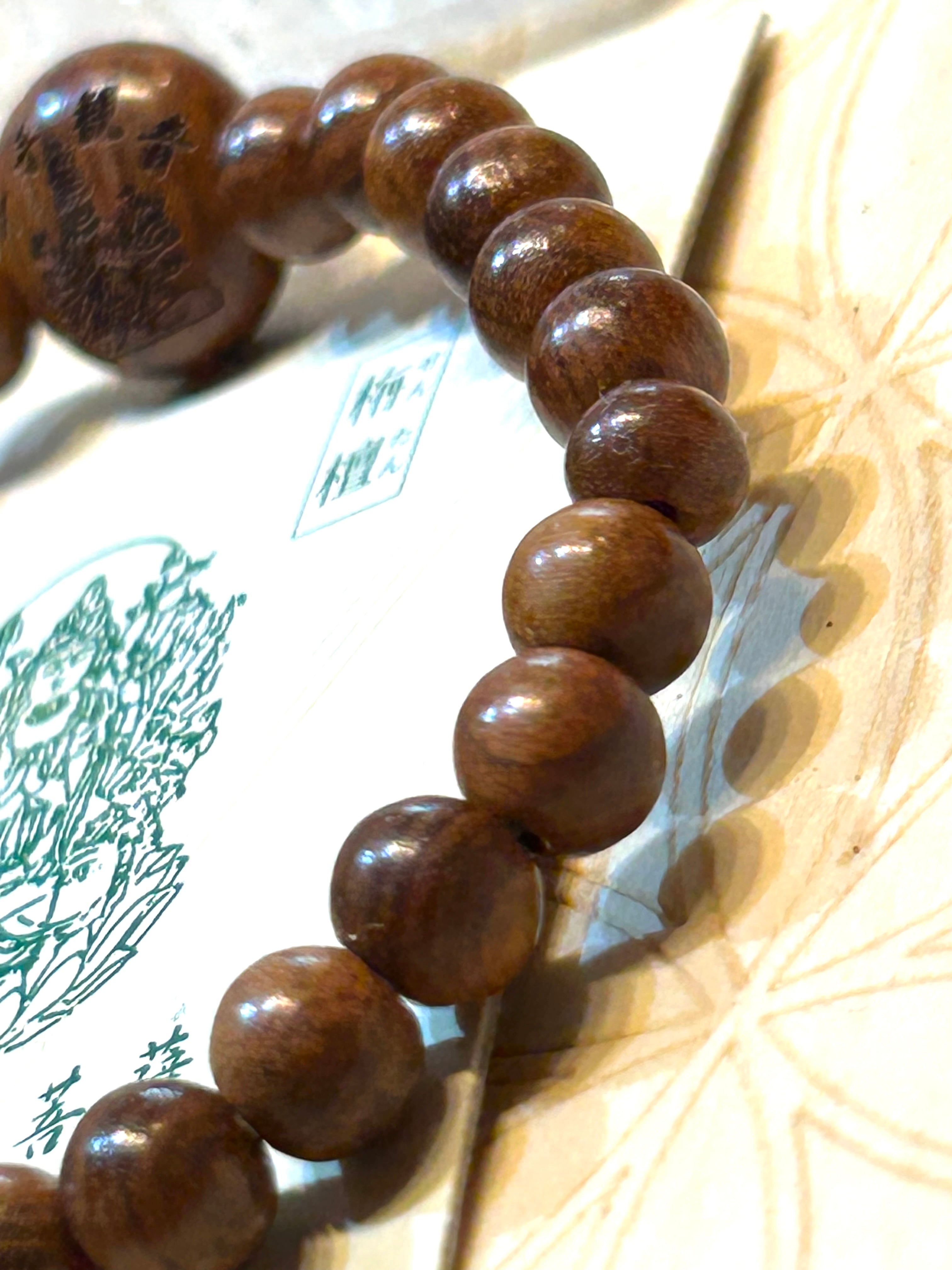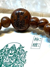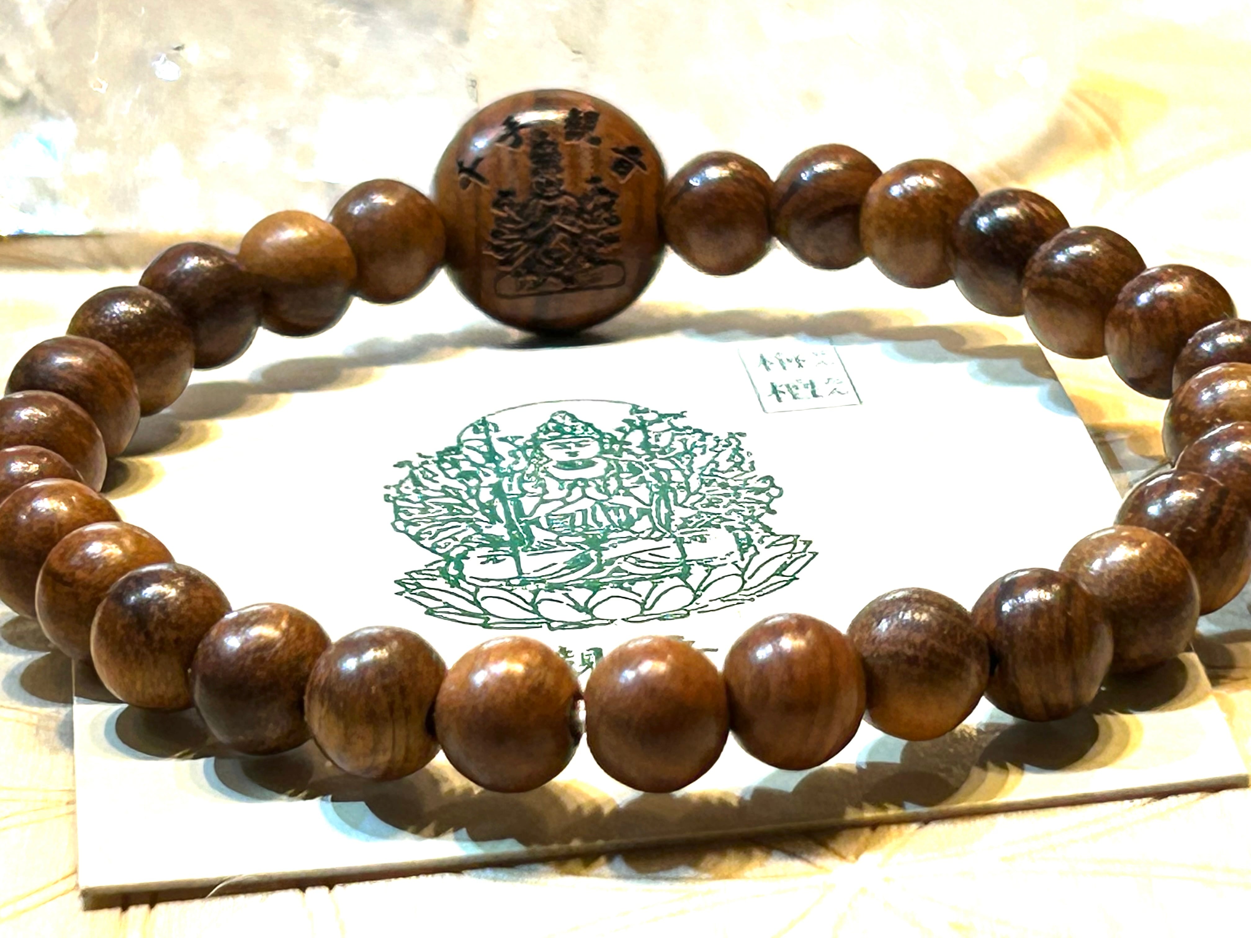 美しい栴檀ビーズを使用したブレスレット。センターには千手観音の刻印が施されており、身に着けることで多様な助けを得る力を感じられます。栴檀は霊的な浄化や深い安らぎを促進し、持つ人に穏やかな気持ちをもたらす特性があります。