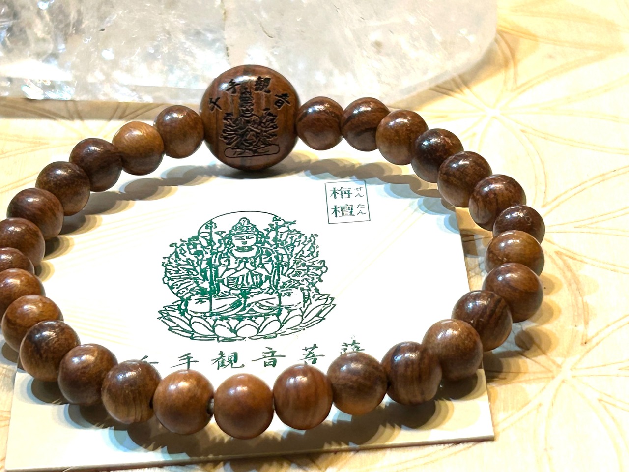 選び抜かれた栴檀ビーズと千手観音のエネルギーを感じながら、特別感を演出するアイテムです。身に着けることで、日々の生活に豊かで癒しのエネルギーをもたらします。