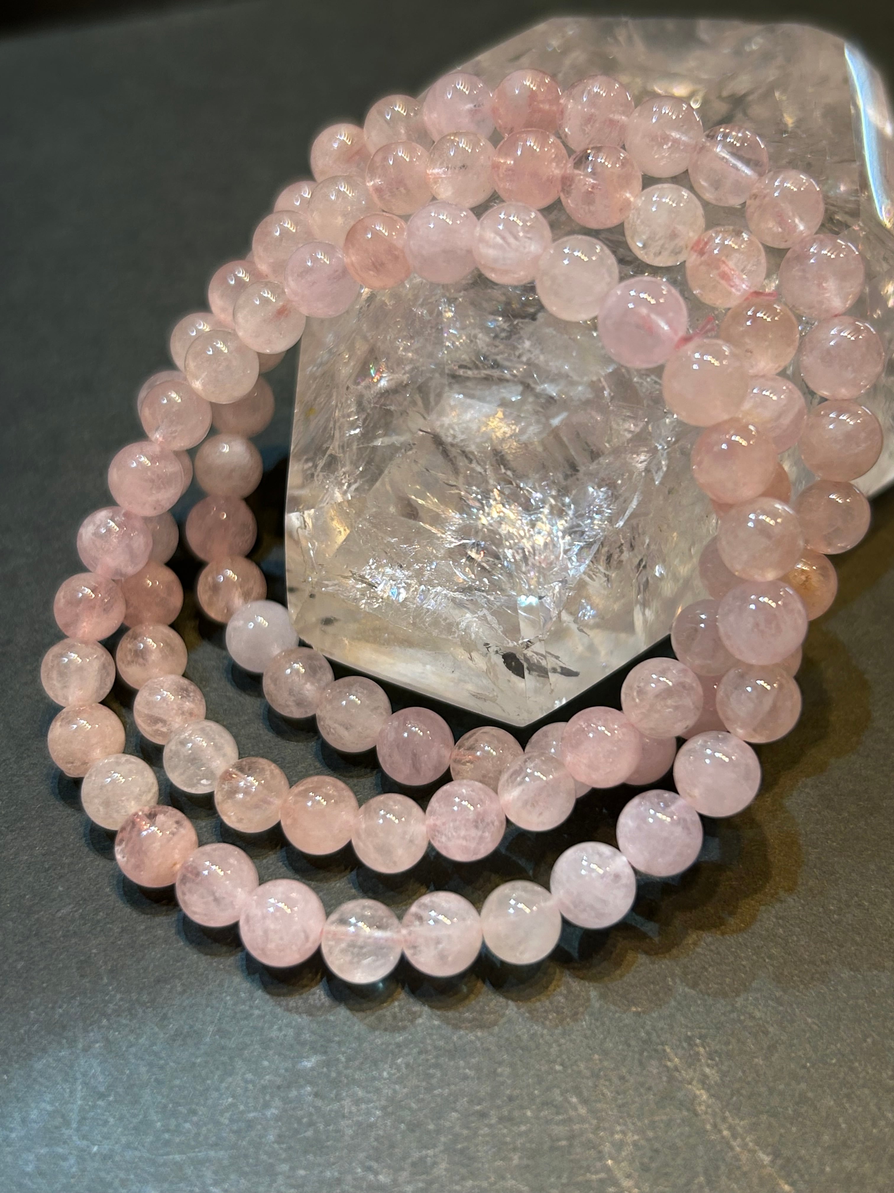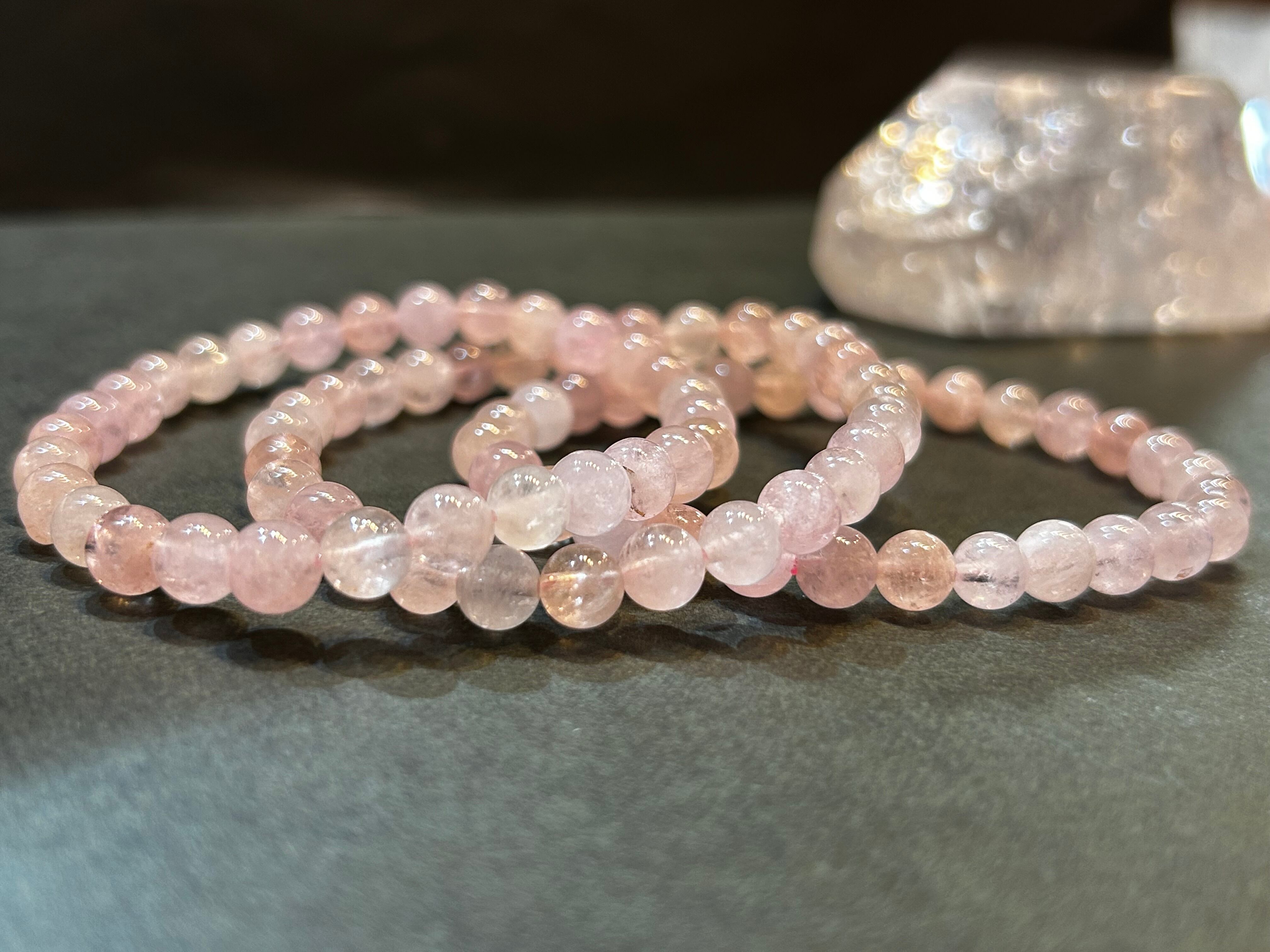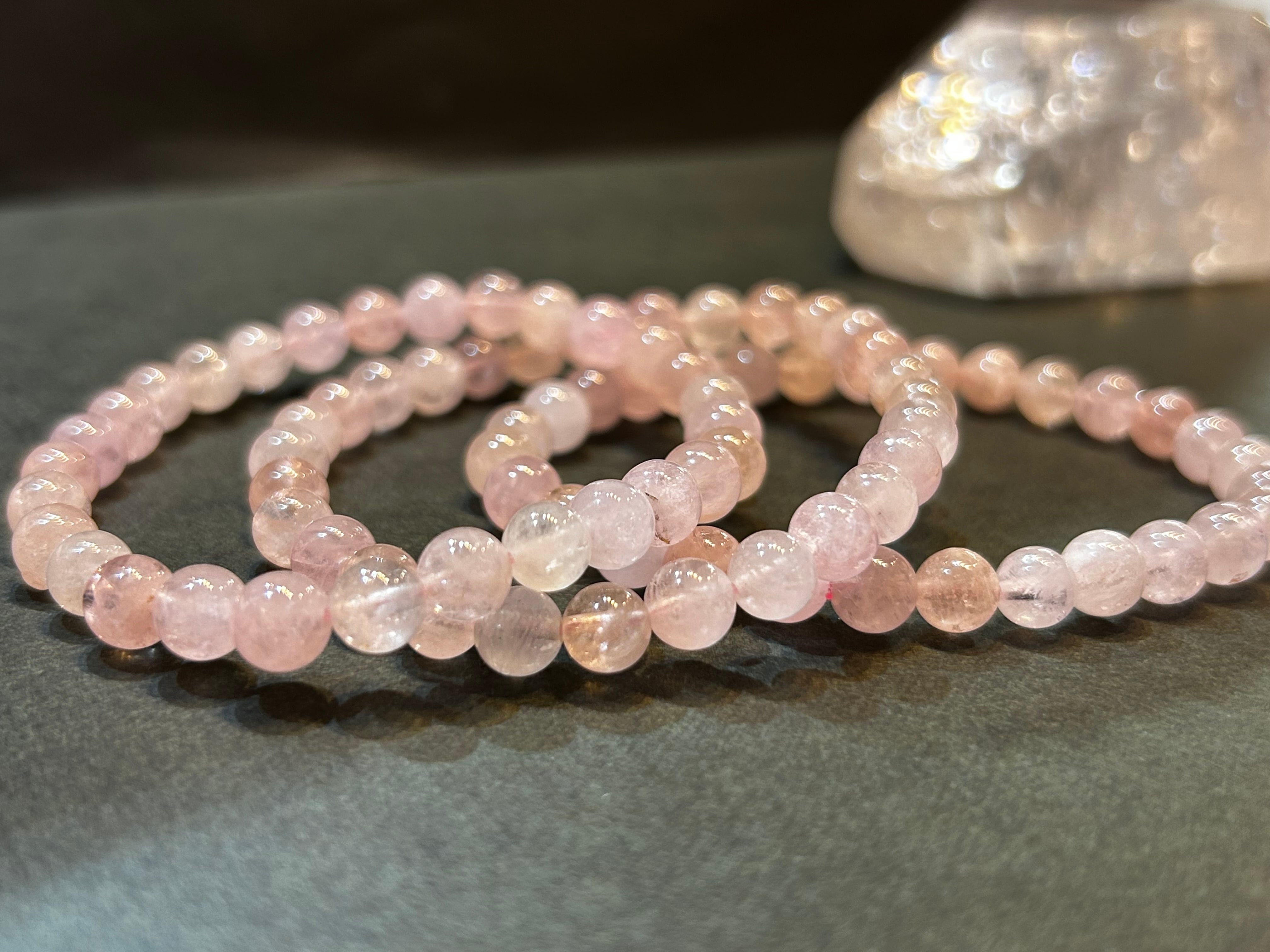 透明感ある美しいモルガナイトを使用した6ミリのブレスレットが登場です。淡いピンク色と優雅な輝きが特徴のこのブレスレットは、まるで心を癒す優しさをそのまま感じることができるアイテムです。持つ人に穏やかな気持ちをもたらし、日常生活をより心豊かに彩ってくれるでしょう。