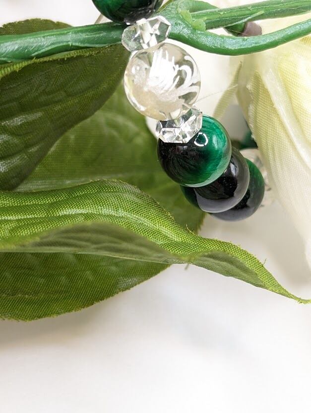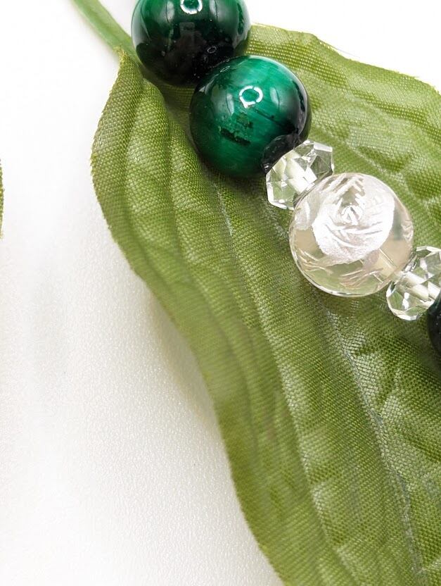 φ10の染色のタイガーアイとφ12の水晶に四神を彫ってある水晶の組み合わせです。