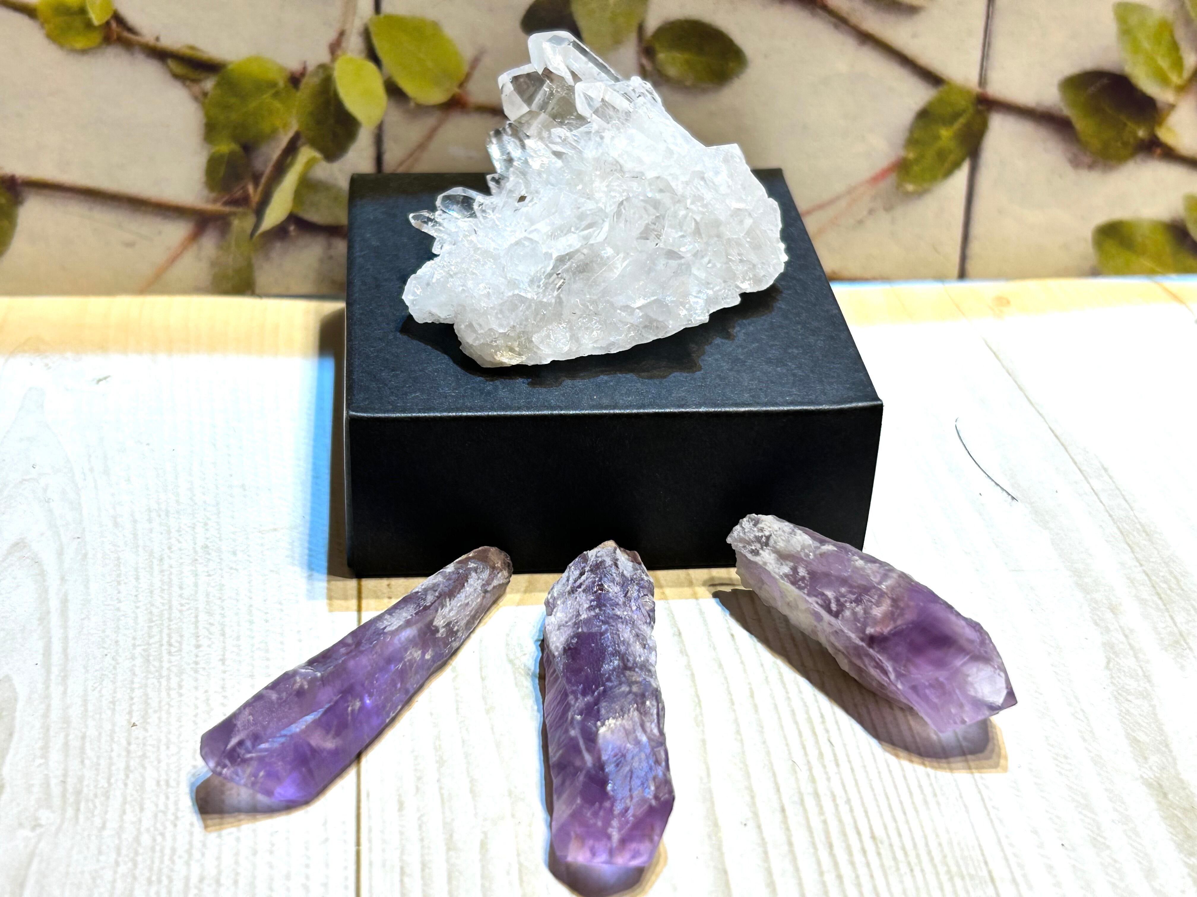 天然のトマス・ゴンザガ産水晶ミニクラスターとバイーア州で産出される美しいアメジストのセットです。
