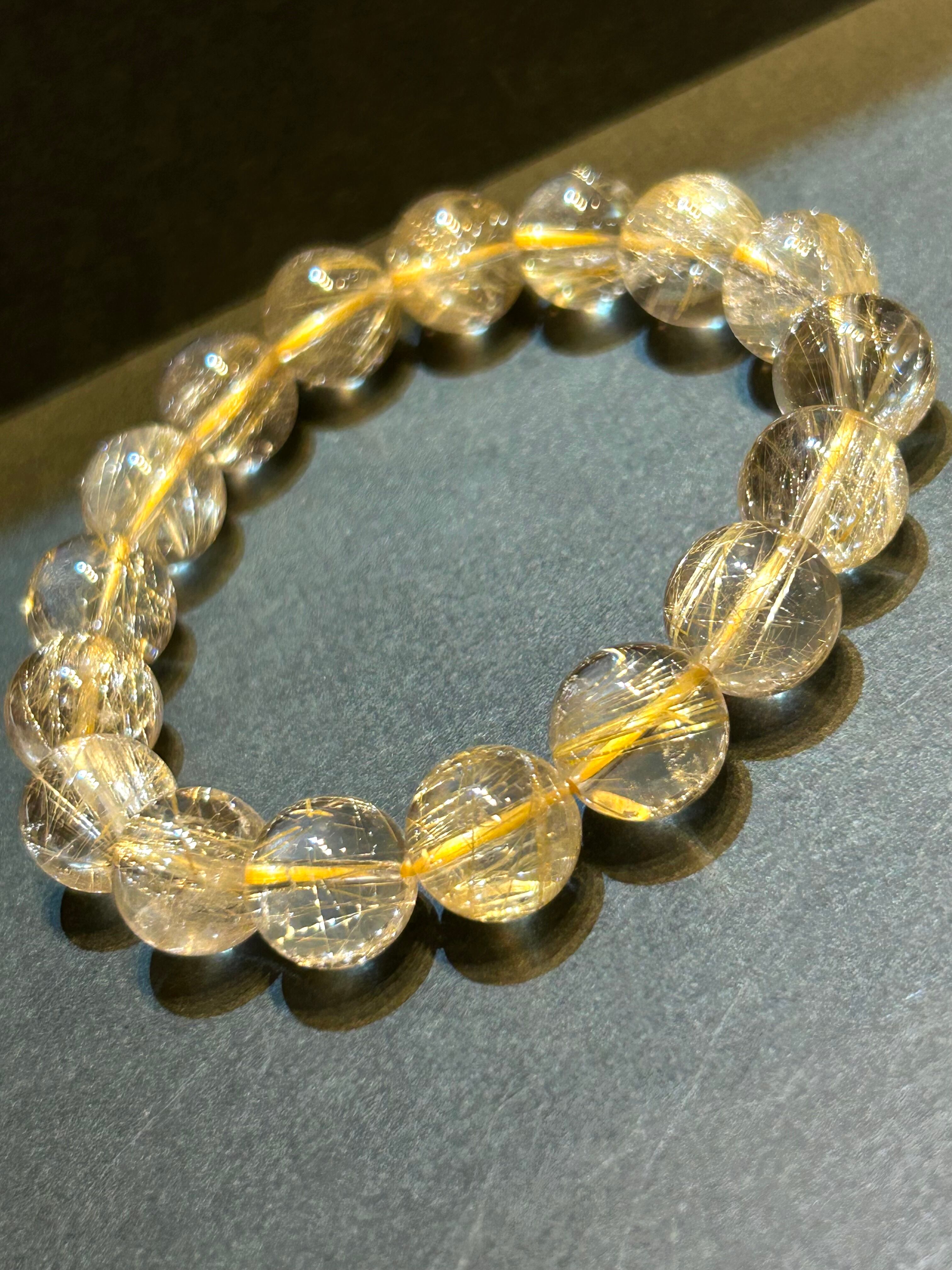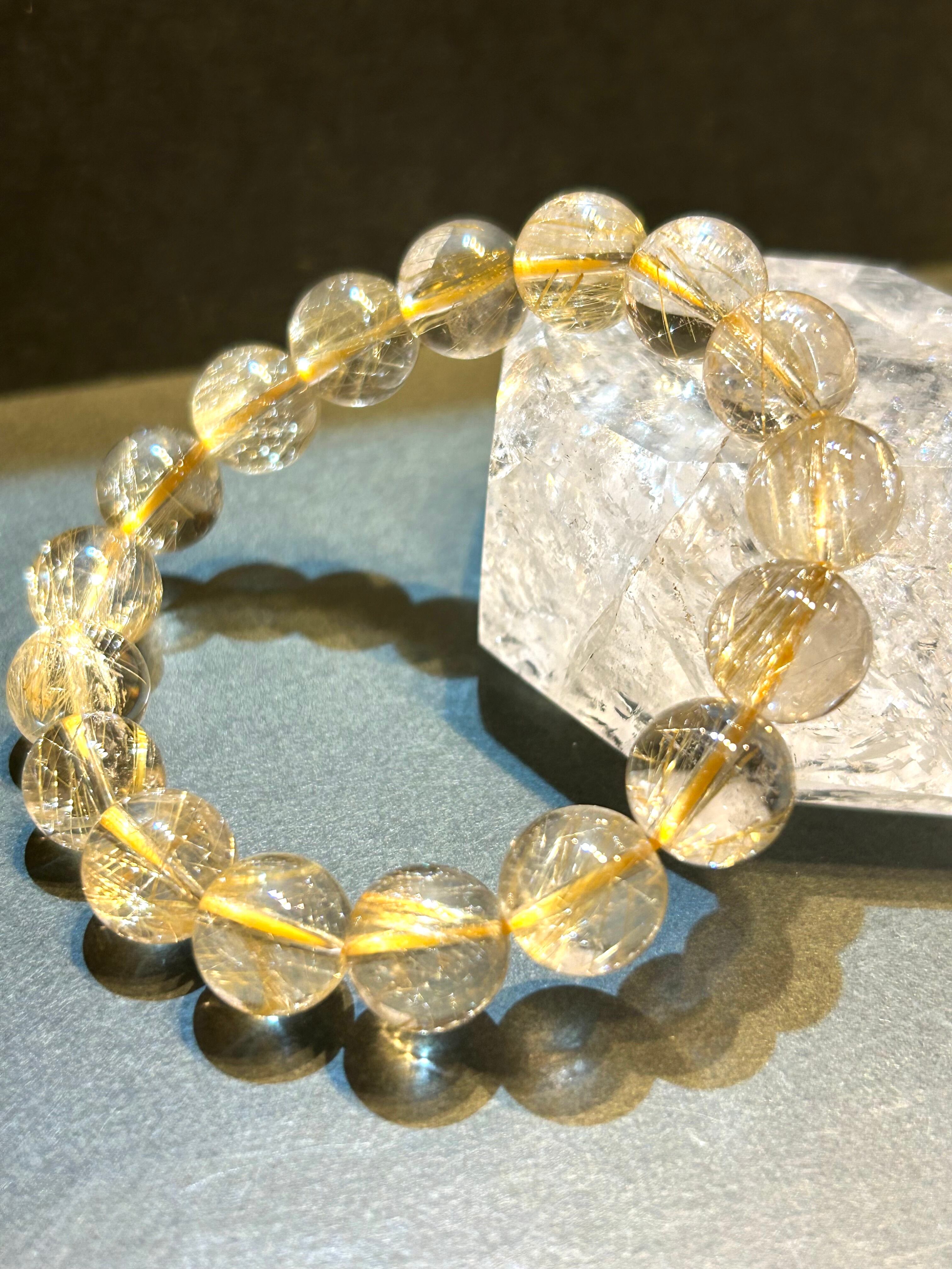 AAAランクのルチルクォーツは、透明感が抜群で、その美しい金色の針状内包物が魅力です。このブレスレットは、持つ人に幸運や繁栄をもたらすと言われ、多くの方々に愛される石です。